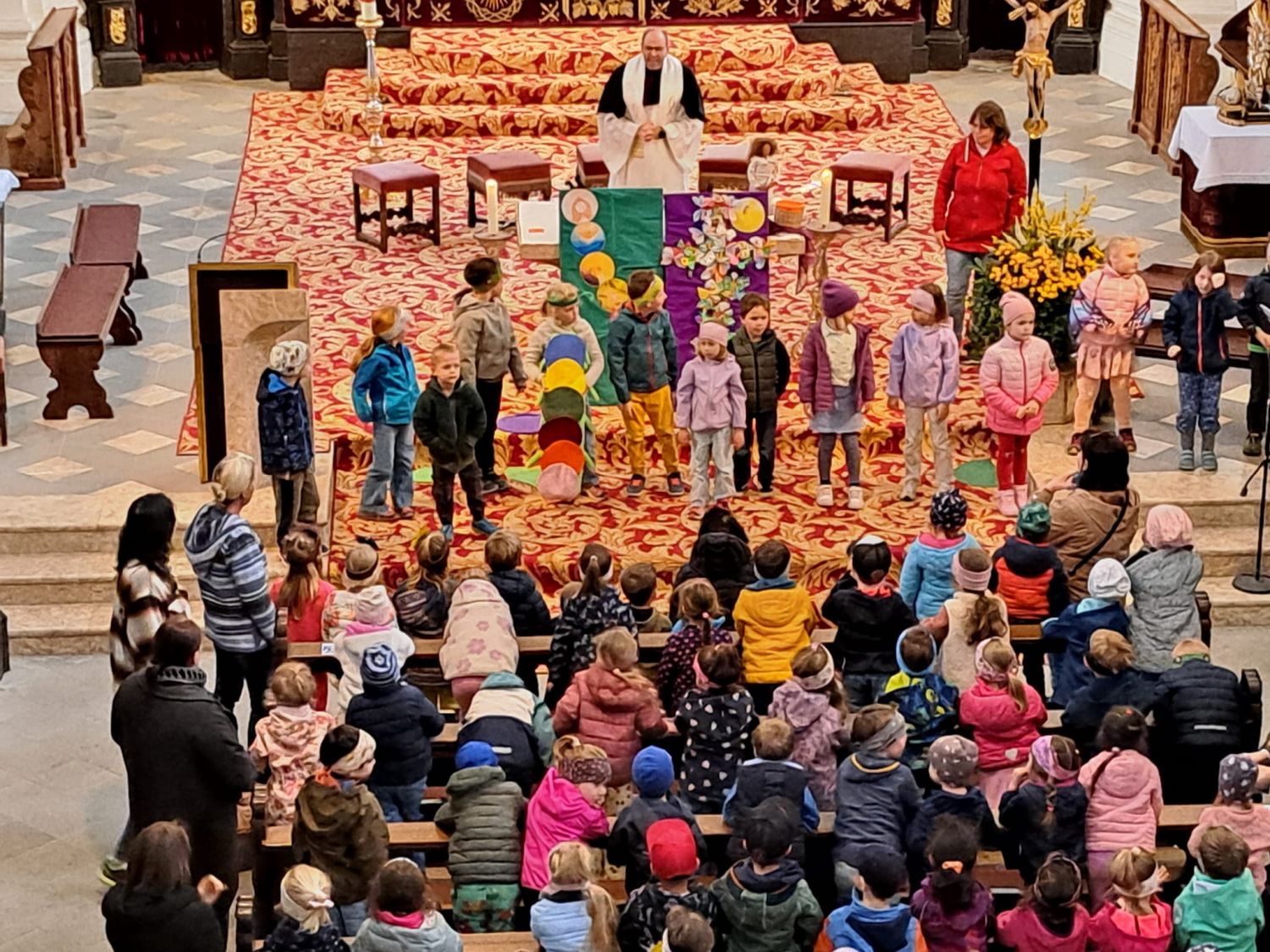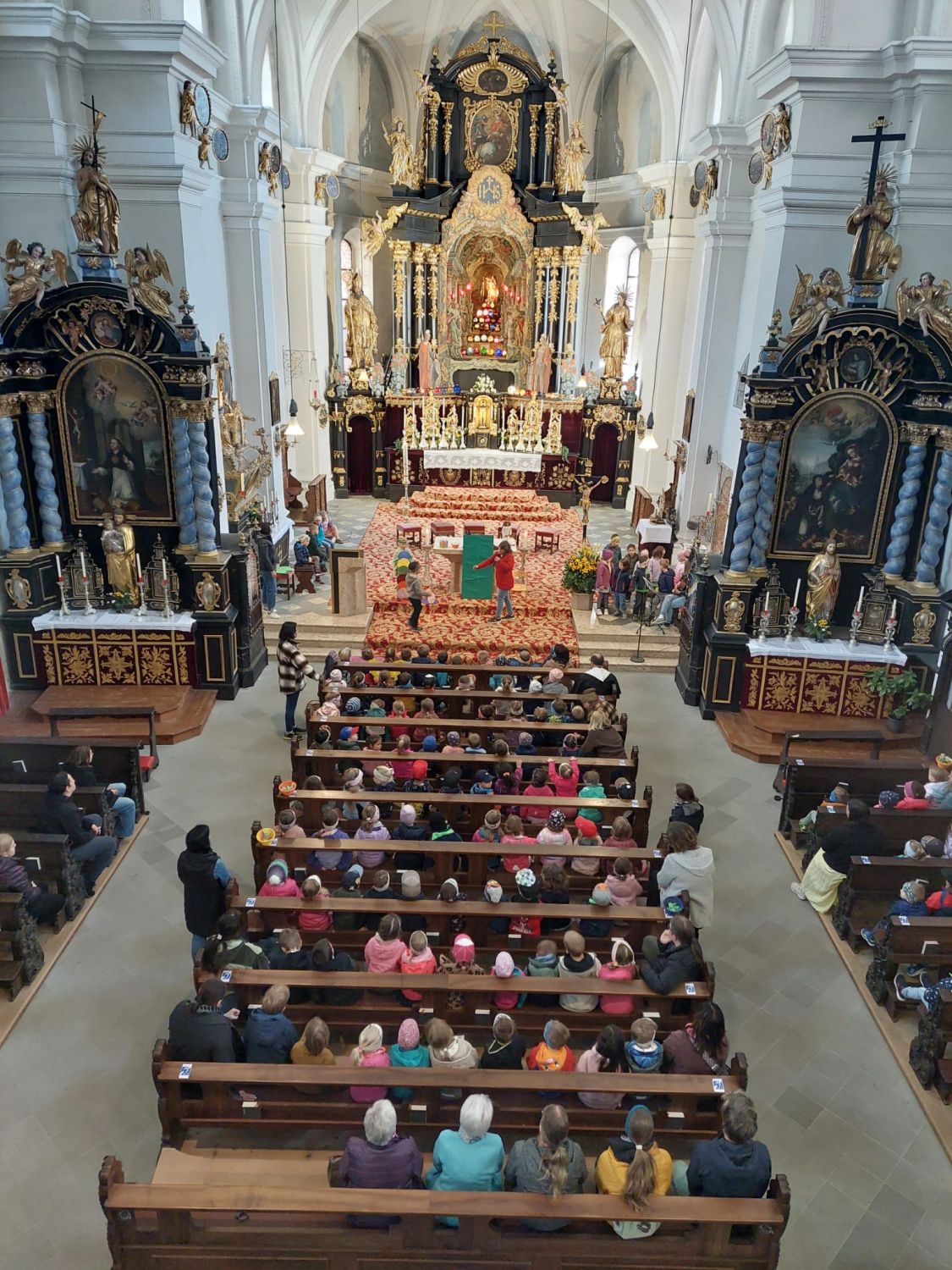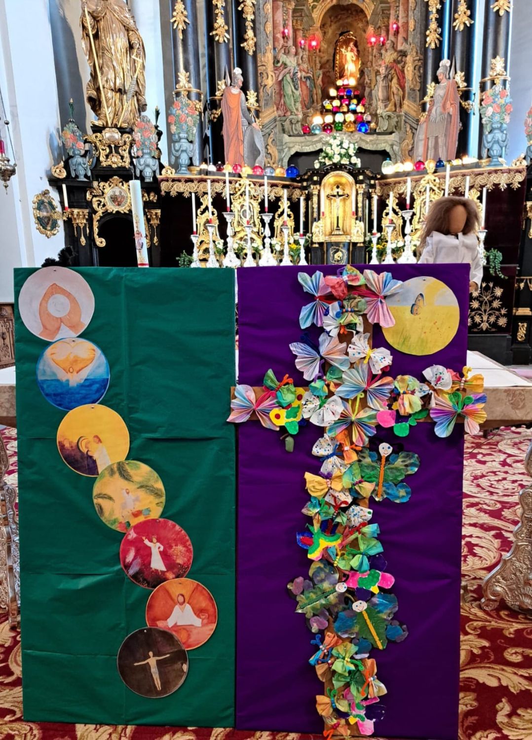 In der Wallfahrtskirche Mariathal wurde diese Botschaft für Kinder auf besondere Weise lebendig. Gemeinsam mit Karin nahm Pfarrer Martin die Kindergartenkinder mit auf eine Reise durch die Ostergeschichte.