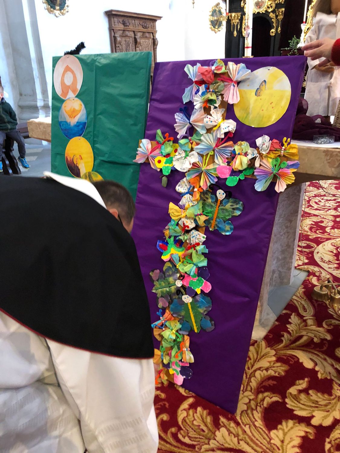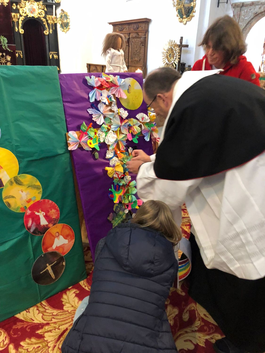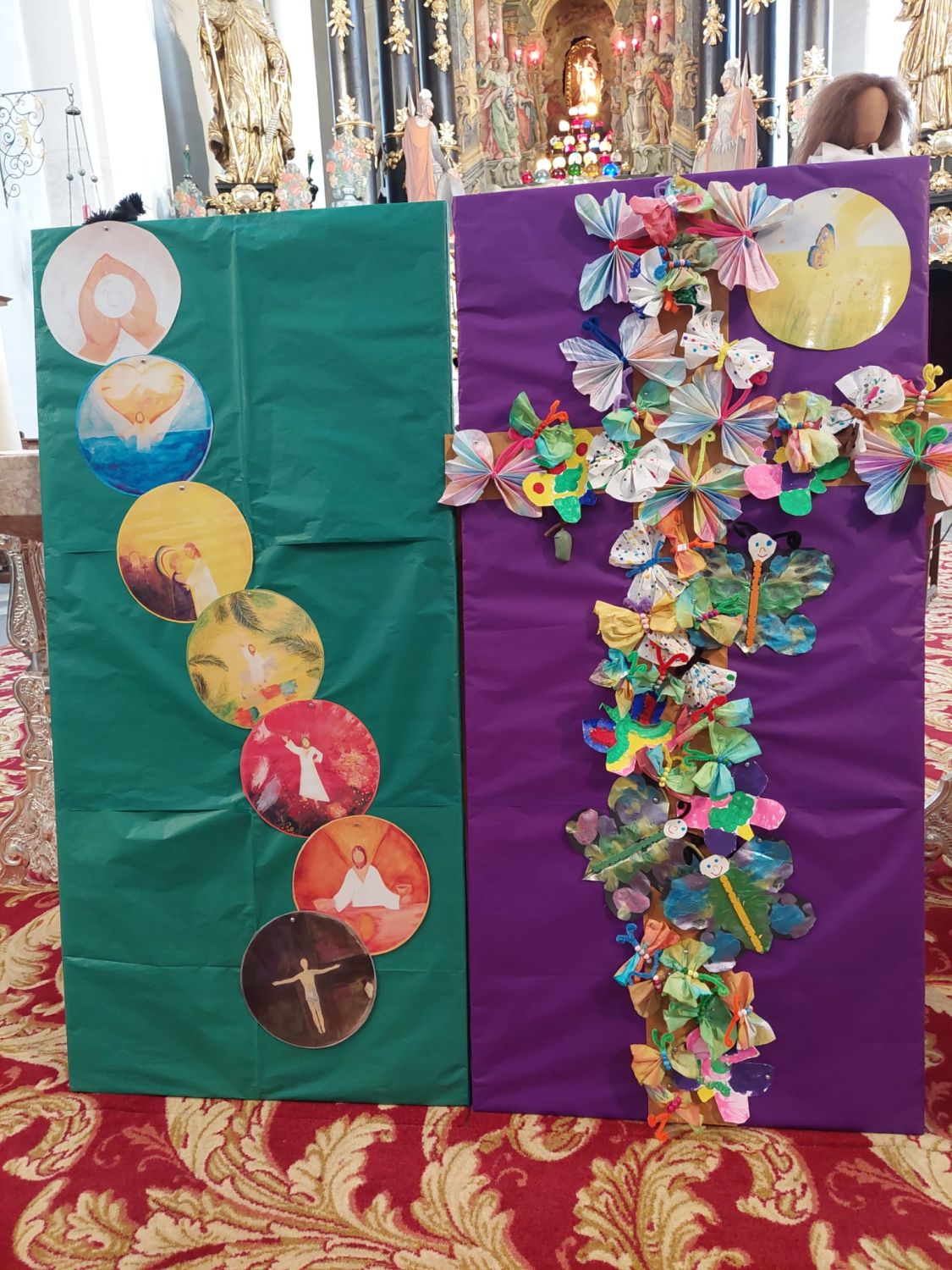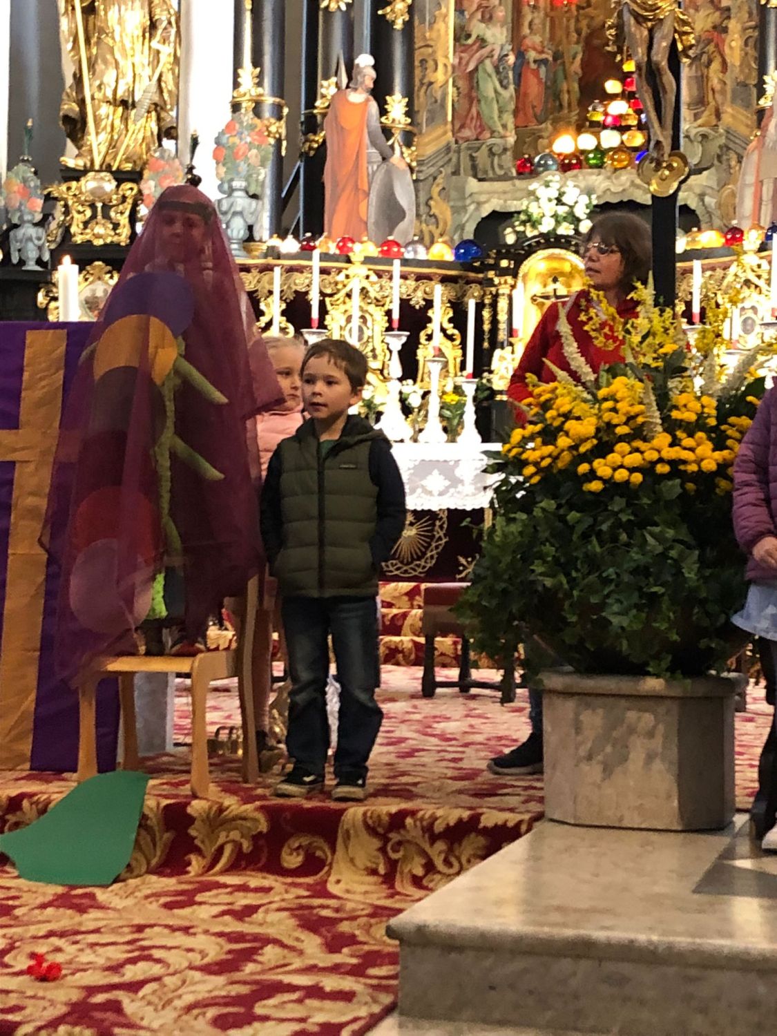 In der Wallfahrtskirche Mariathal wurde diese Botschaft für Kinder auf besondere Weise lebendig. Gemeinsam mit Karin nahm Pfarrer Martin die Kindergartenkinder mit auf eine Reise durch die Ostergeschichte.