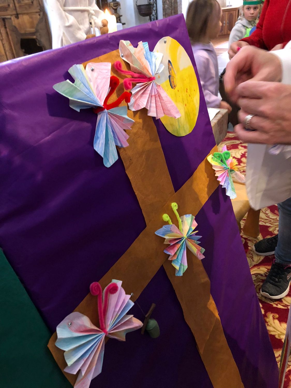 Im Mittelpunkt stand die kleine Raupe Pasquarella. Sie zieht sich in ihren Kokon zurück. Still. Verborgen. Und kehrt schließlich als Schmetterling zurück – verwandelt, neu, lebendig. So wurde die Geschichte von Jesu Leben, Sterben und Auferstehung für die Kinder greifbar und verständlich.
