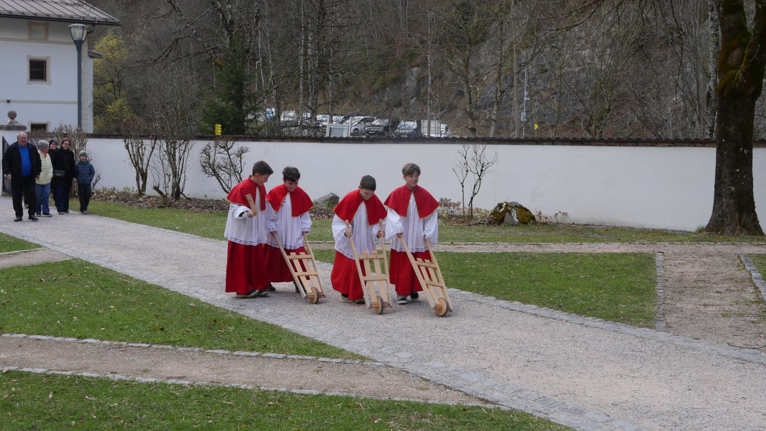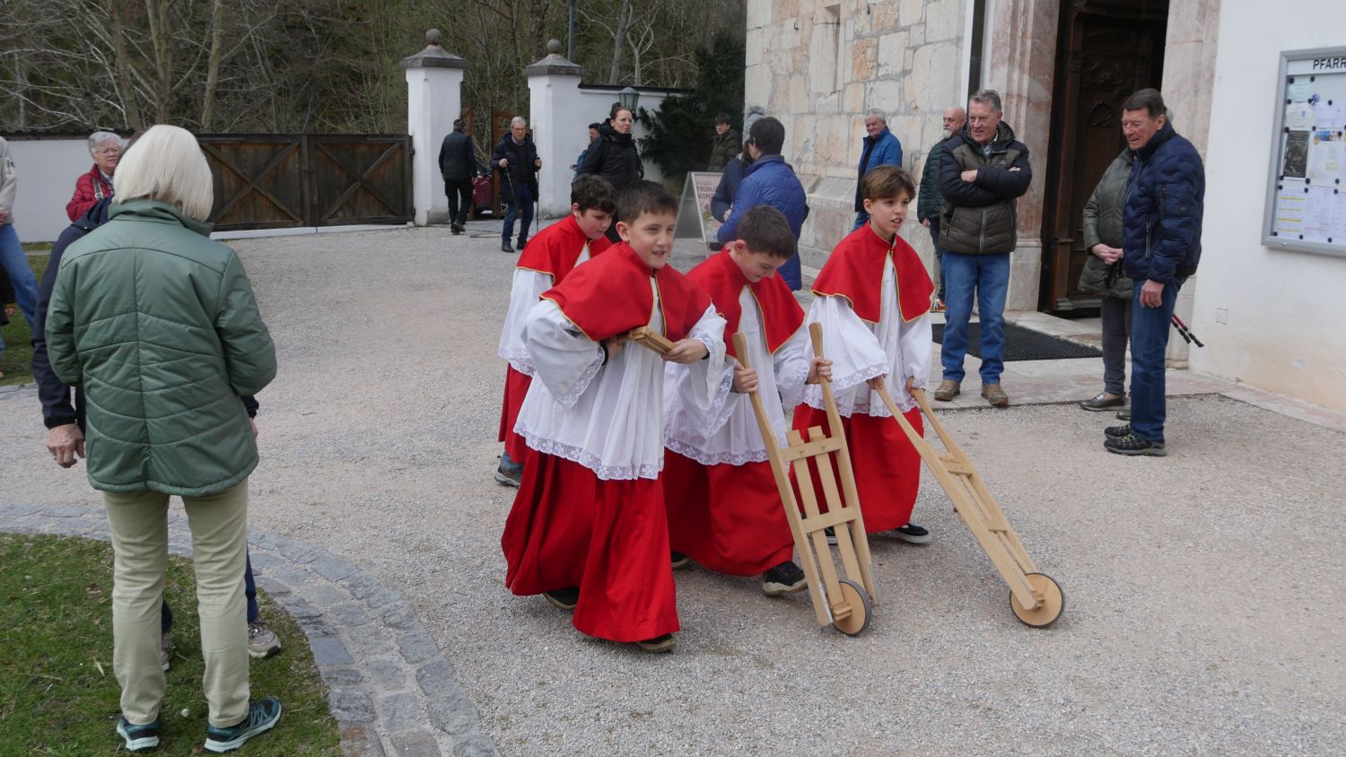 Eine schöne und zugleich traditionsreiche Besonderheit war auch heuer wieder das Engagement unserer Ministranten. Da an den Kartagen bekanntlich keine Glocken läuten – „sie sind ja nach Rom geflogen“ – zogen die Ministranten mit den Ratschen durch den Pfarrhof und übernahmen so auf eindrucksvolle Weise diese Aufgabe.
