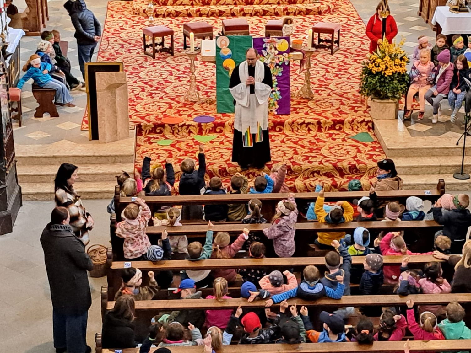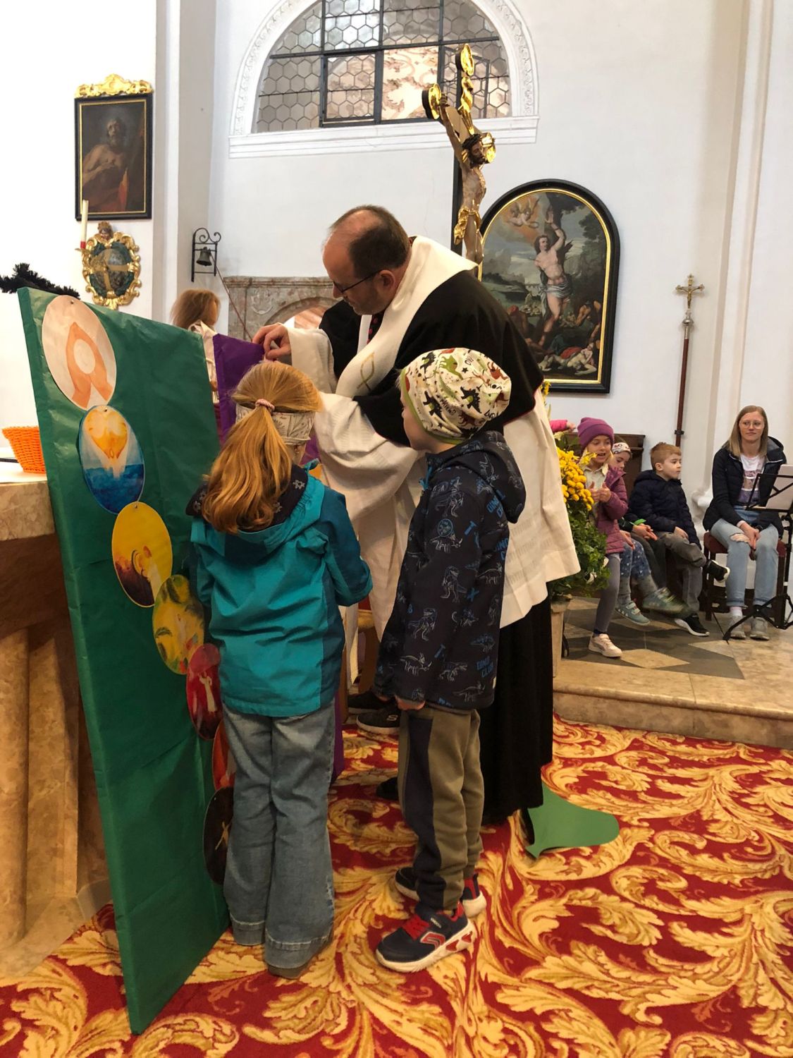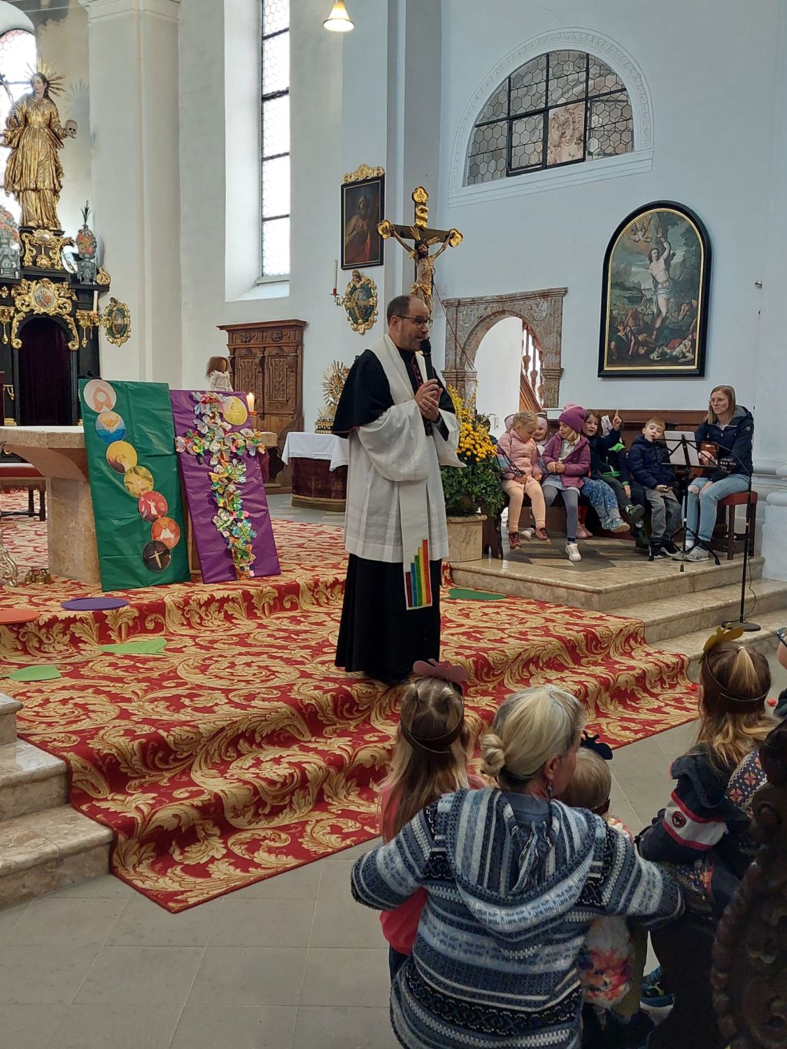 In der Wallfahrtskirche Mariathal wurde diese Botschaft für Kinder auf besondere Weise lebendig. Gemeinsam mit Karin nahm Pfarrer Martin die Kindergartenkinder mit auf eine Reise durch die Ostergeschichte.